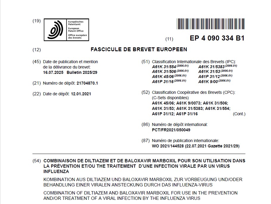 We are proud to announce the grant of our European patent EP 4 090 334 B1 which protects the combination of diltiazem and baloxavir marboxil for use in the prevention and/or treatment of influenza virus infections, and representing a significant milestone in our commitment to innovative antiviral strategies.
